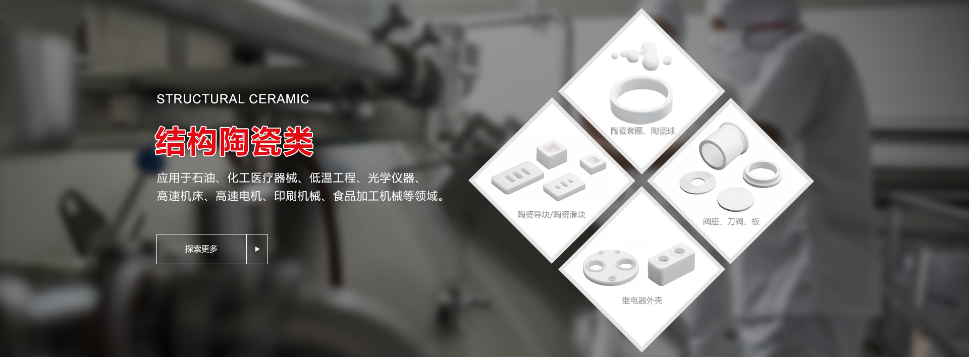 陶瓷套圈、陶瓷球、陶瓷閥門、陶瓷絕緣條、法蘭片、陶瓷滑塊、導塊等精密陶瓷結構件; 應用于石油、化工醫療器械、低溫工程、光學儀器、高速機床、高速電機、印刷機械、食品加工機械等領域。